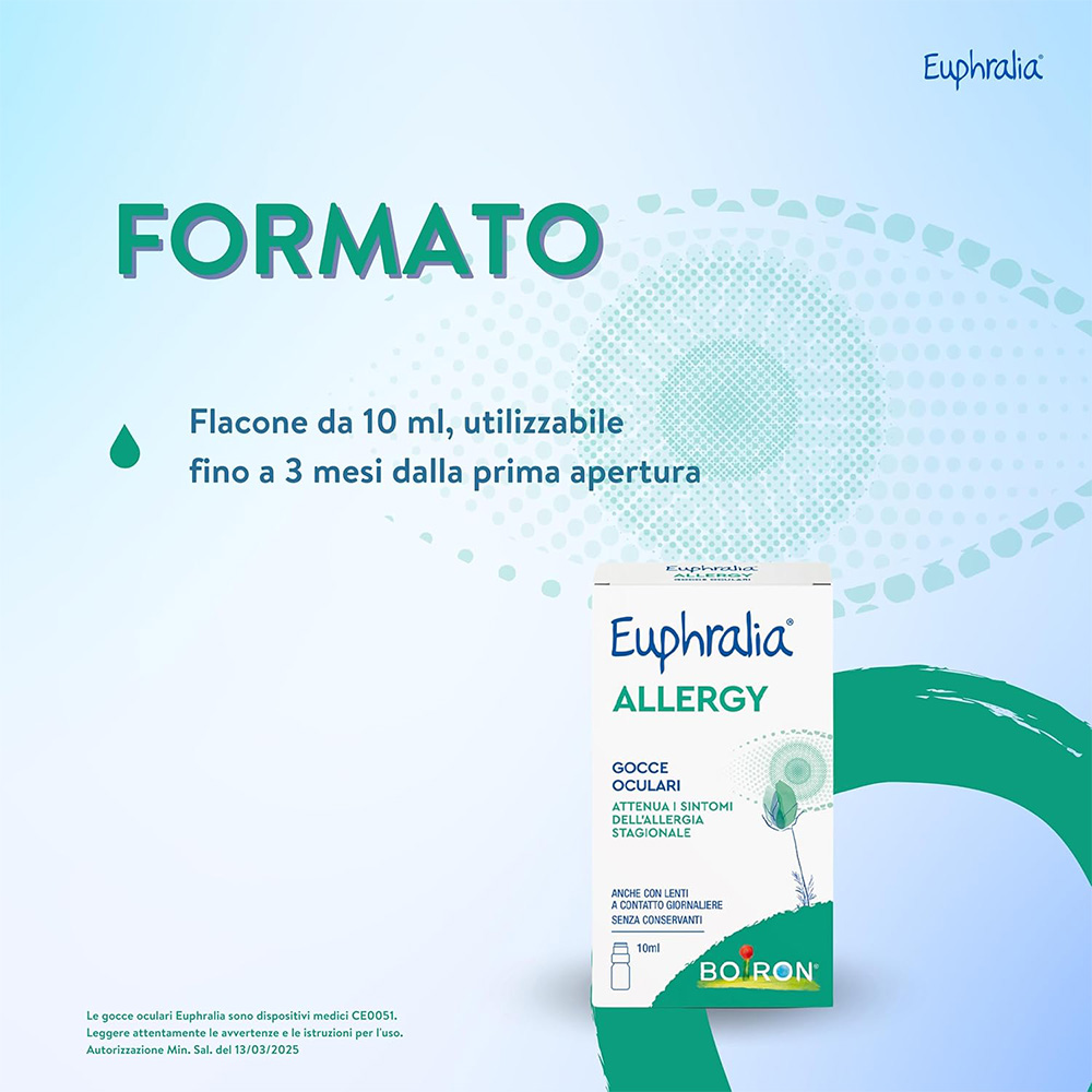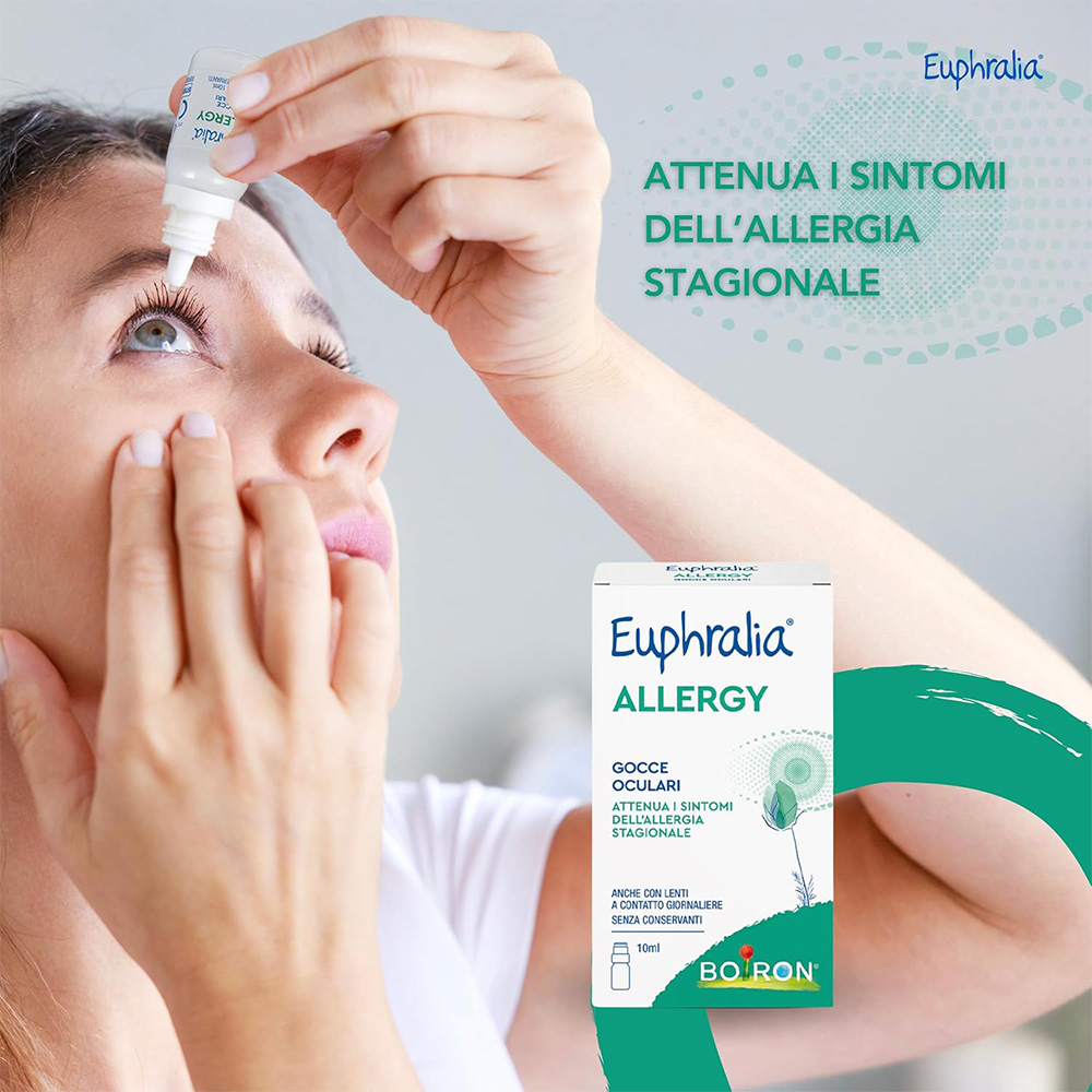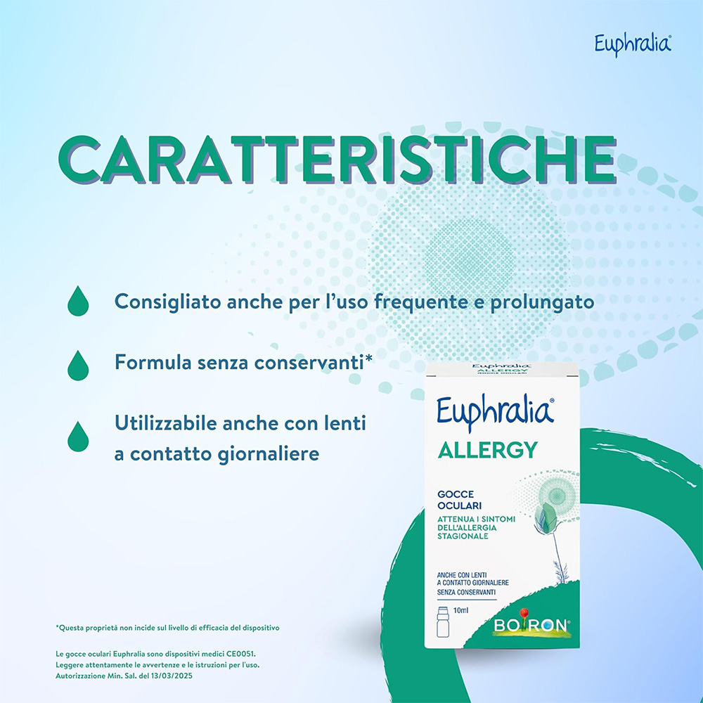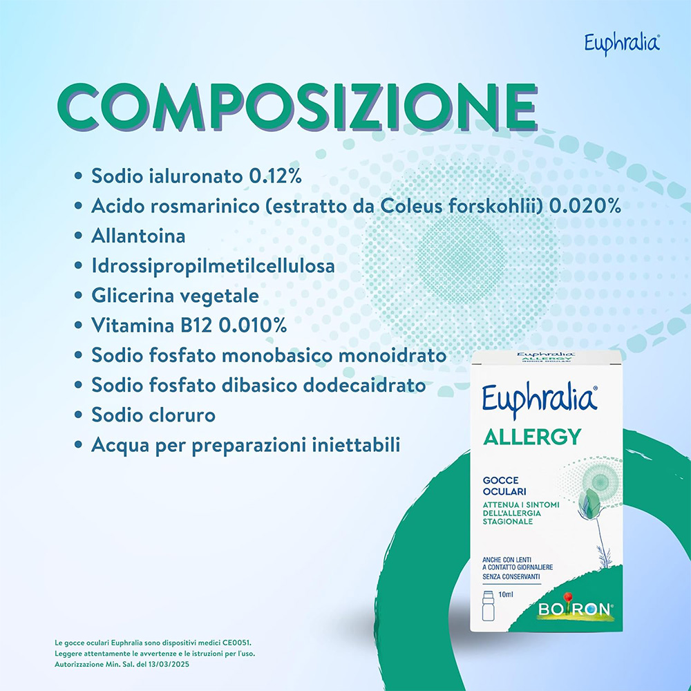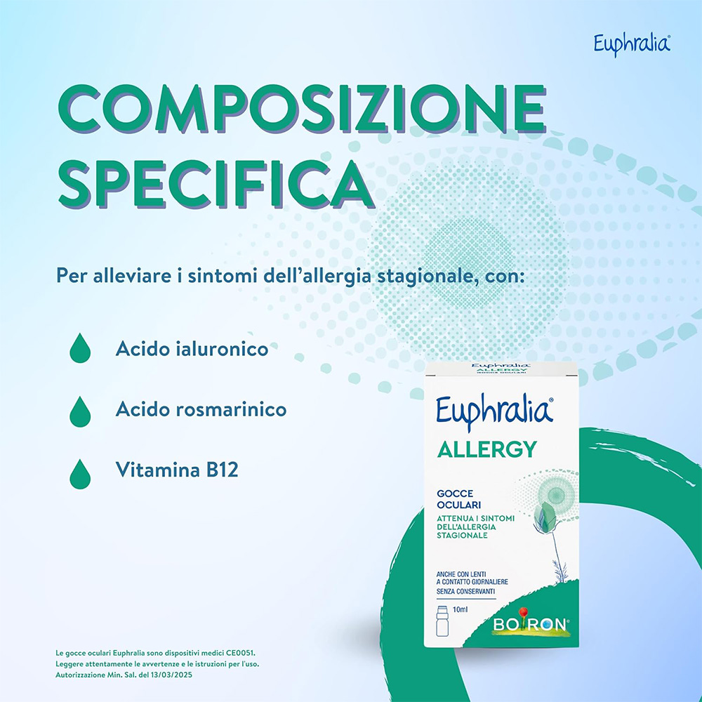 Dispositivo medico. CONGIUNTIVITE ALLERGICA STAGIONALE, SINDROME DELL’OCCHIO SECCO E FASTIDIO OCULARE Attenua i sintomi della congiuntivite allergica stagionale, anche quando associata alla sindrome da occhio secco. Infatti, ripristina il volume delle lacrime, allontana l’allergene dal film lacrimale mediante induzione dell’ammiccamento dovuto all’instillazione delle gocce, contrasta i fenomeni ossidativi potenziando i meccanismi antiossidativi fisiologici. Riduce la sintomatologia dell’occhio secco, di forma lieve o moderata, eventualmente accompagnata da prurito, bruciore, sensazione di corpo estraneo, rossore, dovuta a: • Stress ambientali quali: cambiamenti climatici, inquinamento atmosferico, pulviscolo, esposizione alle radiazioni solari, clima secco o molto caldo, aria condizionata; • Stress meccanici, ad esempio l’inefficiente ammiccamento dovuto all’uso prolungato del computer o per guida, studio, utilizzo delle lenti a contatto per periodi prolungati; • Età, stato di menopausa o post-menopausa; fisiologica diminuzione dell’assorbimento della vitamina B12 introdotta con l’alimentazione; • Carenze nutrizionali come il diminuito o non sufficiente apporto di vitamine; • Blefariti. In questo caso l’ammiccamento a seguito dell’instillazione delle gocce oculari facilita anche il distacco di eventuali secrezioni presenti sulla rima ciliare. AZIONE ANTIOSSIDANTE Euphralia ALLERGY gocce oculari per l’associazione di Acido Rosmarinico e Vitamina B12 espleta un’attività antiossidante indicata per contrastare l’azione dei radicali liberi (che si generano sulla superficie oculare a seguito dell’esposizione alle radiazioni solari), che negli anni danneggiano sia l'epitelio pigmentato sia i fotorecettori inducendo la degenerazione maculare e provocano l’opacizzazione del cristallino con insorgenza di cataratta. Inoltre, in virtù della sua azione antiossidante, Euphralia ALLERGY gocce oculari scherma e protegge gli occhi dai danni indotti da radiazioni UV e luce blu, sia di origine naturale (solare) che artificiale come schermi di PC, Tablet, Smartphone e TV. Euphralia Allergy gocce oculari è indicato anche per uso frequente e prolungato. Euphralia Allergy gocce oculari può essere utilizzato in presenza di lenti a contatto giornaliere: una leggerissima variazione della colorazione delle lenti, rilevabile al momento della rimozione dagli occhi, non ne influenza le proprietà ottiche.