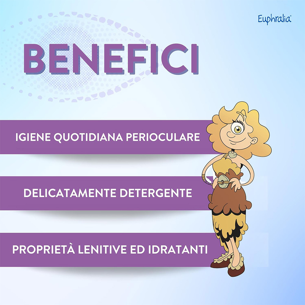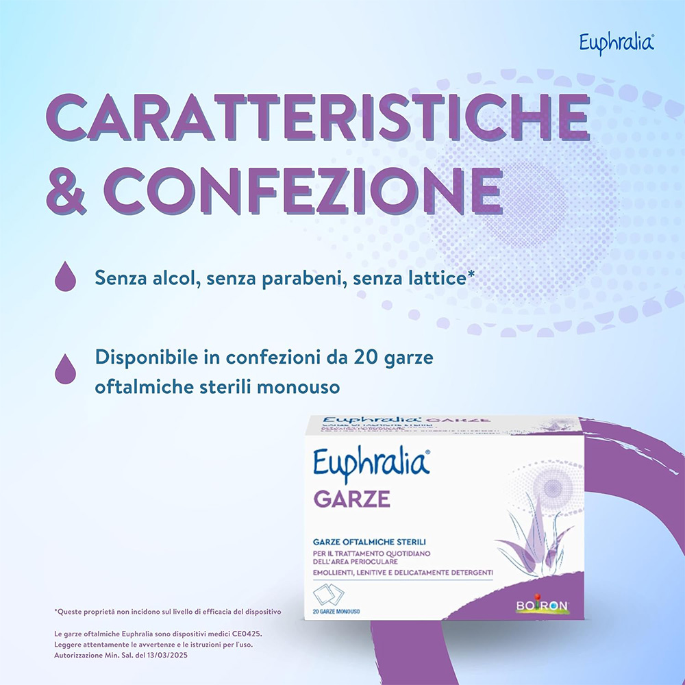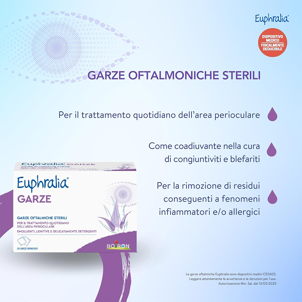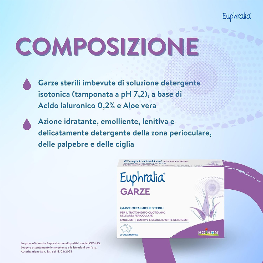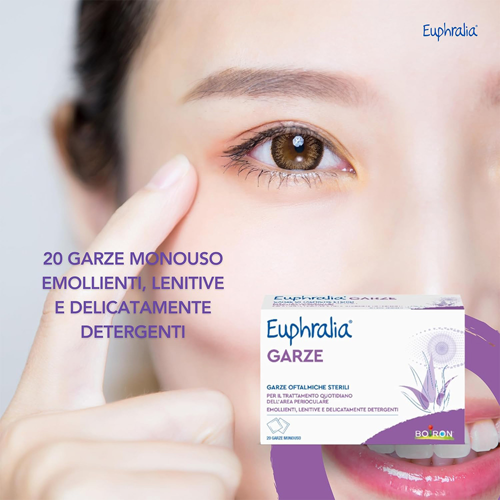 Garze sterili monouso imbevute di soluzione isotonica a base di Acido ialuronico ed Aloe vera, ad azione idratante, emolliente, lenitiva e delicatamente detergente della zona perioculare, delle palpebre e delle ciglia. Euphralia® GARZE sono indicate per la rimozione di residui da desquamazione della superficie palpebrale o secrezioni conseguenti a fenomeni infiammatori e/o allergici o come coadiuvante nella cura di alcune patologie oftalmiche come congiuntiviti, blefariti e blefarocongiuntiviti. Euphralia® GARZE trovano impiego per il trattamento prima e dopo interventi di chirurgia oftalmica.