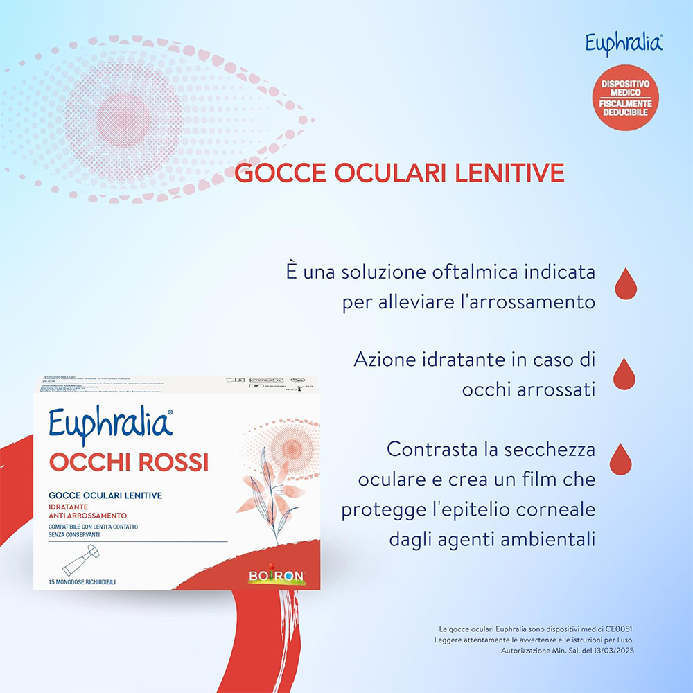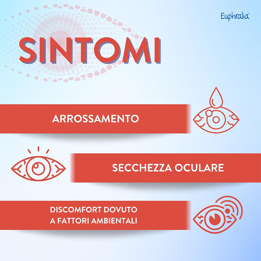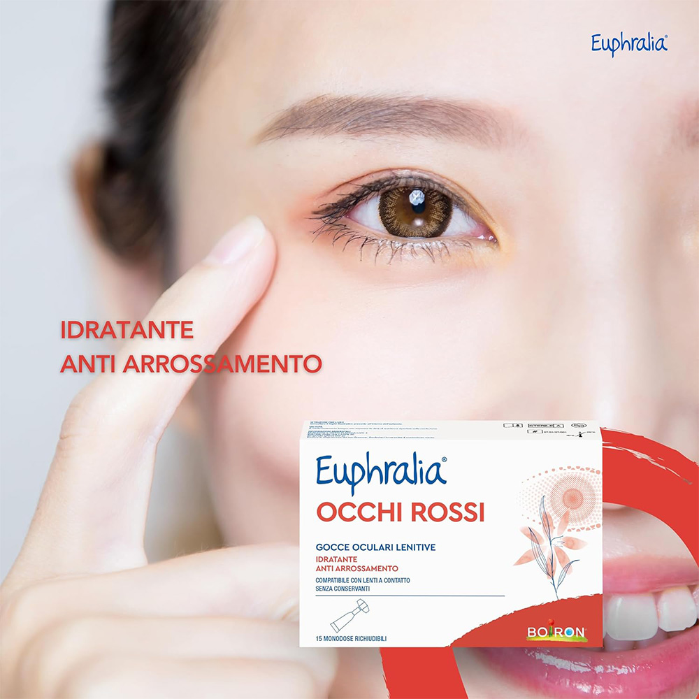 Dispositivo medico. Euphralia® OCCHI ROSSI gocce oculari lenitive è indicato in caso di secchezza oculare o discomfort dell’occhio o della mucosa oculare dovuti a: • fattori ambientali (aria condizionata, esposizione prolungata a raggi solari, vento, fumo, inquinamento, acqua di mare o piscina); • secchezza oculare dovuta a eccessiva stanchezza dovuta a lunghe ore di lavoro al computer oppure allo studio o alla sindrome dell’occhio secco; • utilizzo per molte ore al giorno di lenti a contatto.