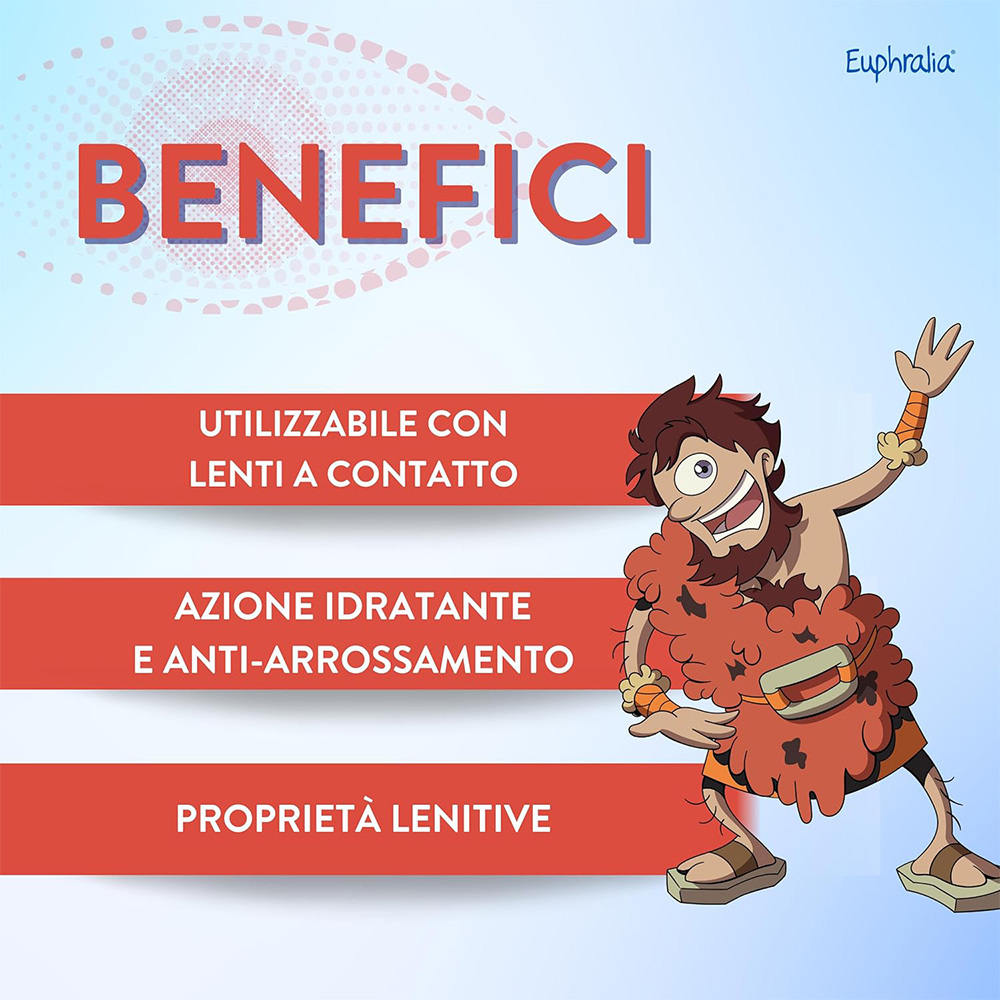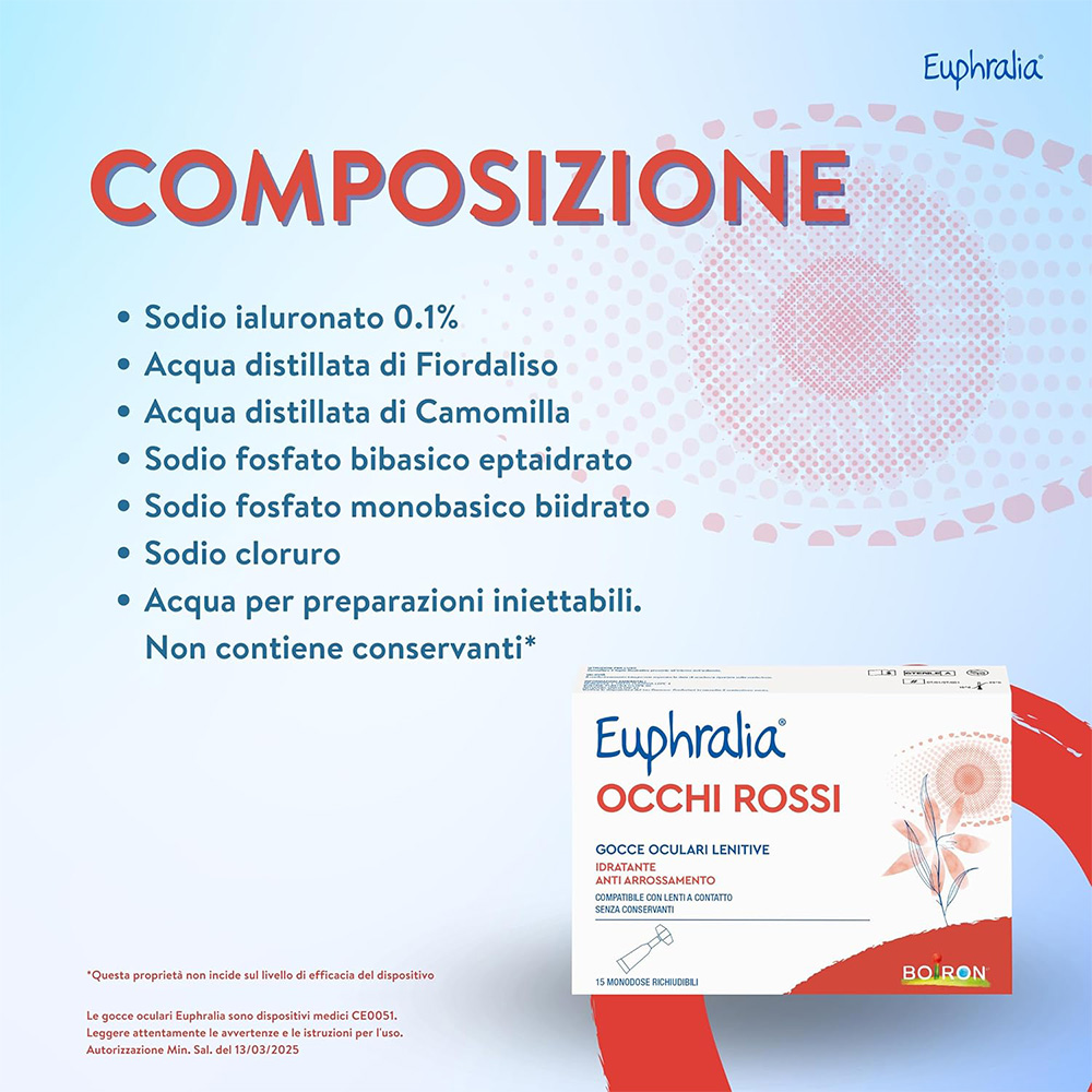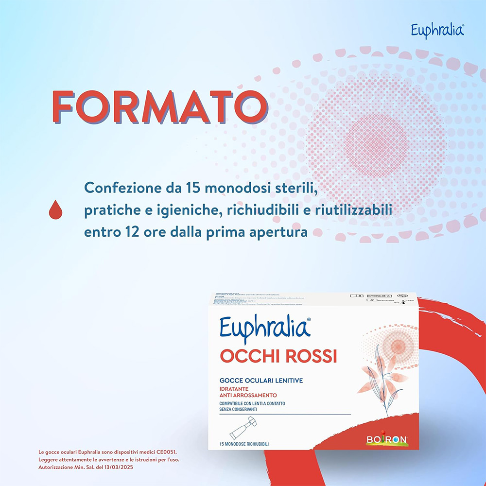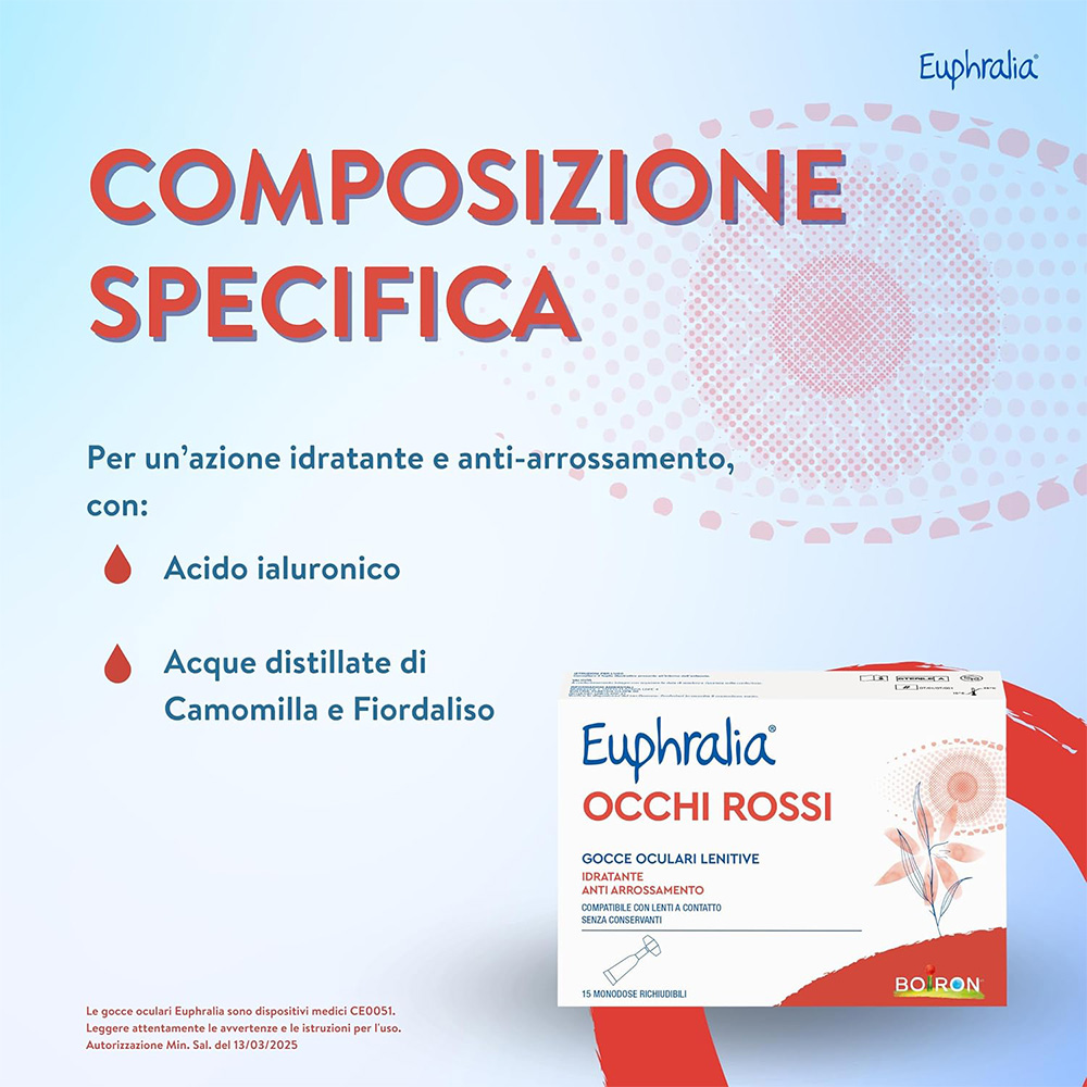 Dispositivo medico. Euphralia® OCCHI ROSSI gocce oculari lenitive è indicato in caso di secchezza oculare o discomfort dell’occhio o della mucosa oculare dovuti a: • fattori ambientali (aria condizionata, esposizione prolungata a raggi solari, vento, fumo, inquinamento, acqua di mare o piscina); • secchezza oculare dovuta a eccessiva stanchezza dovuta a lunghe ore di lavoro al computer oppure allo studio o alla sindrome dell’occhio secco; • utilizzo per molte ore al giorno di lenti a contatto.