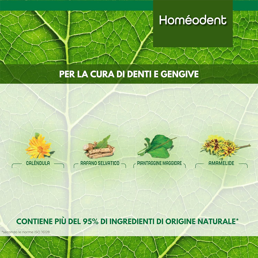 Grazie alla sua formula unica, a base di fluoro ed estratti di piante accuratamente selezionate, Homéodent trattamento sbiancante contribuisce a ripristinare il bianco naturale dei denti, con un effetto protettivo sullo smalto. Le piante selezionate presenti in Homéodent trattamento sbiancante sono raccolte a mano da raccoglitori professionisti, in modo da conservare tutte le loro proprietà benefiche. Il nostro approccio alla raccolta è responsabile e sostenibile al fine di rispettare la biodiversità e assicurare la sopravvivenza alle specie di piante. Contiene più del 95% di ingredienti di origine naturale secondo le norme ISO 16128. Compatibile con un trattamento omeopatico.