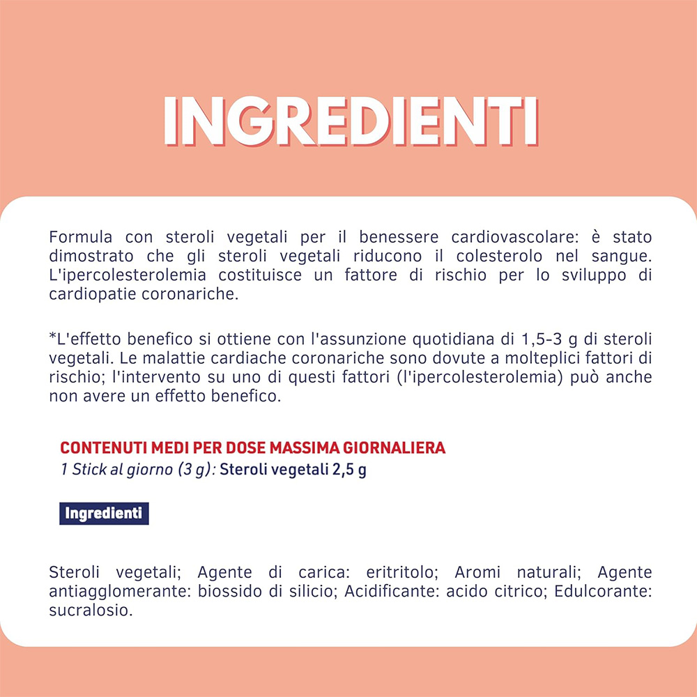Steroli vegetali; Agente di carica: eritritolo; Aromi naturali; Agente antiagglomerante: biossido di silicio; Acidificante: acido citrico; Edulcorante: sucralosio.