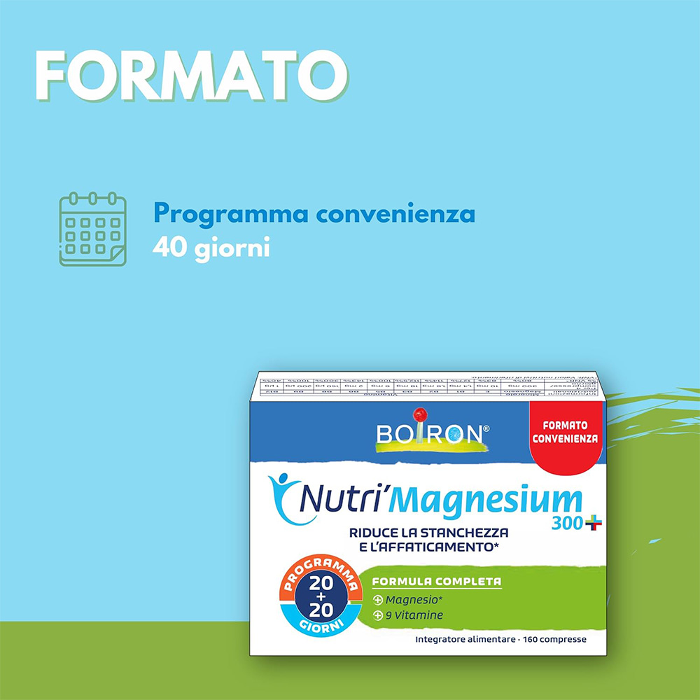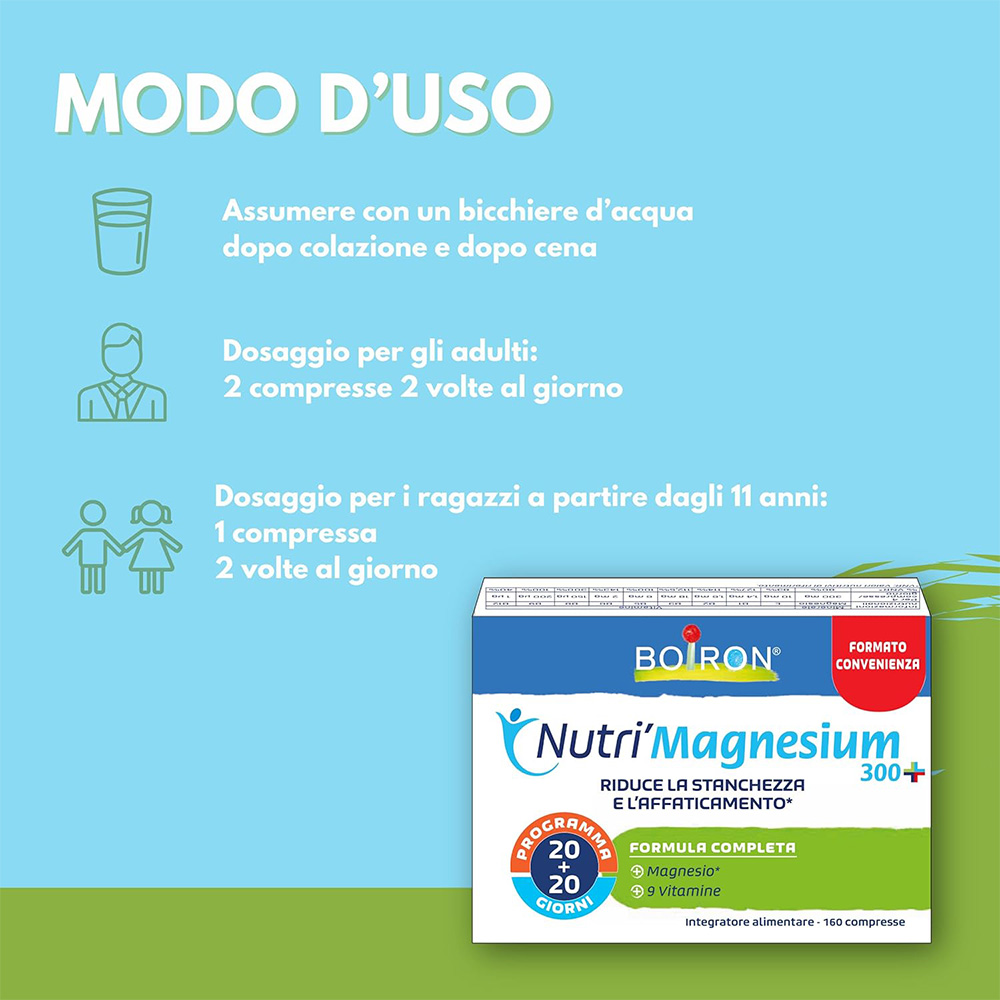Integratore alimentare ricco in magnesio e vitamine per ridurre la stanchezza e l'affaticamento Stanchezza e irritabilità sono spesso i primi segni di una carenza di Magnesio. Il Magnesio contenuto in Nutri'Magnesium 300+: • Aiuta a ridurre la stanchezza. • Contribuisce al normale funzionamento del sistema nervoso. • Contribuisce al corretto funzionamento del sistema muscolare.