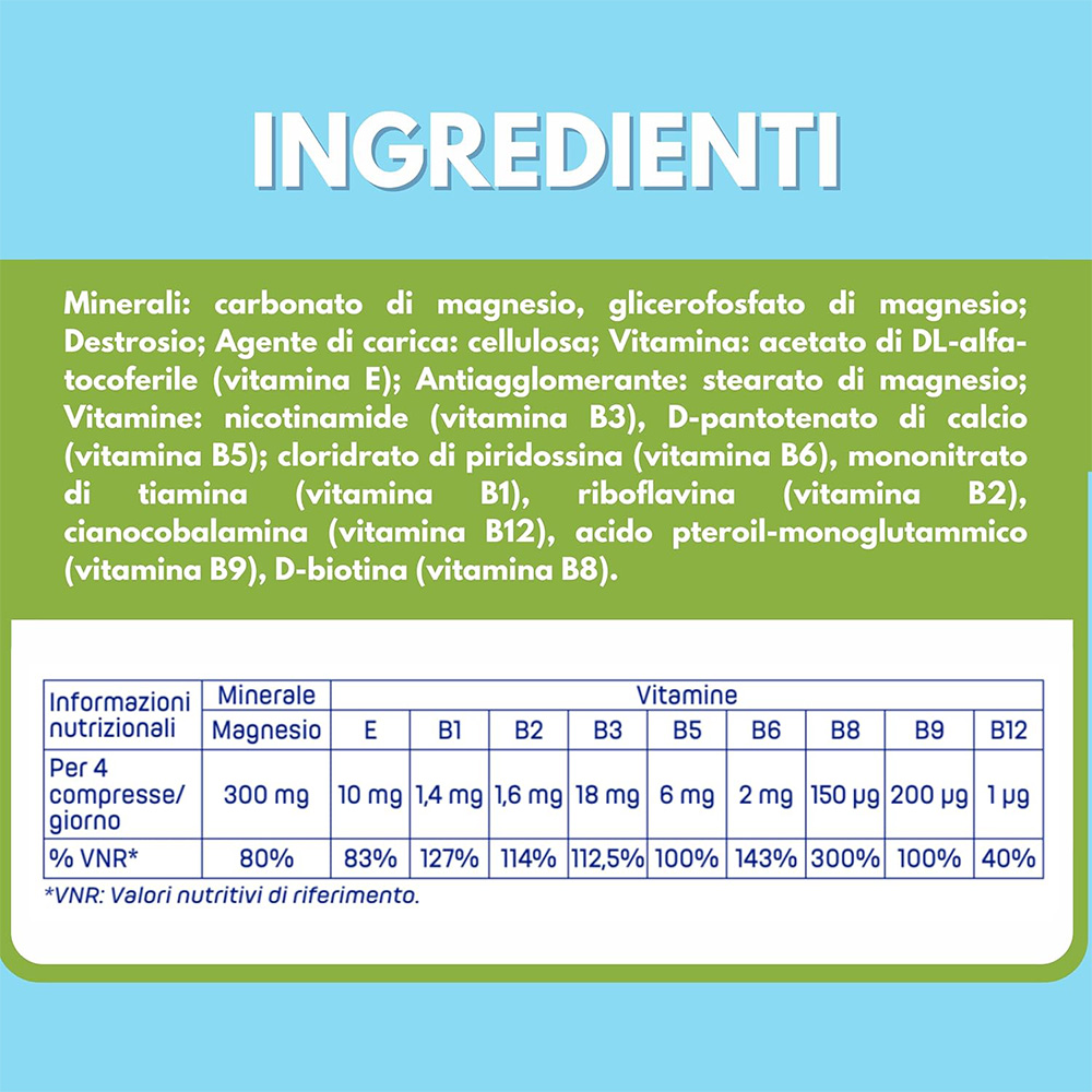 Minerali: carbonato di magnesio, glicerofosfato di magnesio; Destrosio; Agente di carica: cellulosa; Vitamina: acetato di DL-alfa-tocoferile (vitamina E); Antiagglomerante: stearato di magnesio; Vitamine: nicotinamide (vitamina B3), D-pantotenato di calcio (vitamina B5); cloridrato di piridossina (vitamina B6), mononitrato di tiamina (vitamina B1), riboflavina (vitamina B2), cianocobalamina (vitamina B12), acido pteroil-monoglutammico (vitamina B9), D-biotina (vitamina B8).