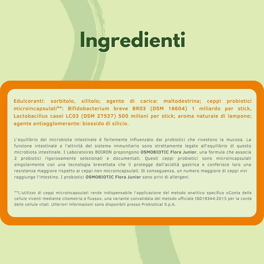 Edulcoranti: sorbitolo, xilitolo; agente di carica: maltodestrina; ceppi probiotici microincapsulati*: Bifidobacterium breve BR03 (DSM 16604) 1 miliardo per stick, Lactobacillus casei LC03 (DSM 27537) 500 milioni per stick; aroma naturale di lampone; agente antiagglomerante: biossido di silicio.